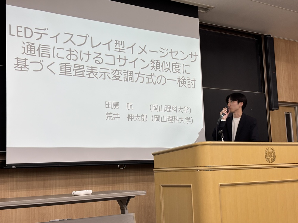 理工学研究科 システム科学専攻 修士課程1年(荒井研究室所属)の田房 航さん(工学部電気電子システム学科卒業生)が、2026年3月16日および17日に信州大学 長野キャンパスで開催された電子情報通信学会 ワイドバンドシステム研究会において、可視光通信に関する研究成果を発表しました。発表題目は以下の通りです。